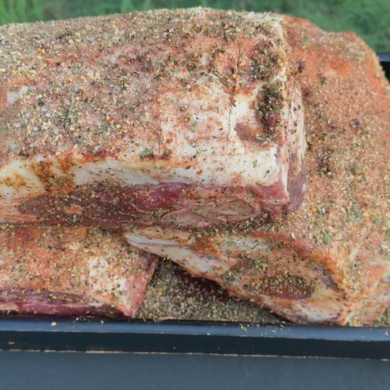 This roast offers a balanced bite — slightly firmer than a Boston roast, with savory depth and satisfying chew. The Mangalitsa fat renders during cooking, keeping the meat moist and enhancing its naturally rich, porky flavor. Expect a crispier exterior when smoked or roasted with the skin on.
